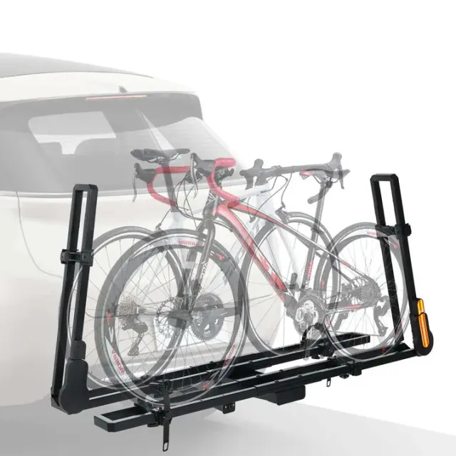 - Description: Sold by Gear Antics, this Hitch Receiver Bike Rack is designed with a single arm and accommodates two bicycles. Upgraded hitch bike carrier fits all standard 2-inch hitch receivers. The adaptive safety pin eliminates the need for manual hole position checks—simply push in, and the pin locks automatically, ensuring convenience. Includes an anti-theft lock for added protection. Featuring the upgraded single load arm with seamless regulation and tire ratcheting strap, our design securely grips both front and rear wheels, ensuring stability and ease of installation. Easily tilt the hitch bike rack platform down for convenient trunk access. When not in use, the foldable design allows for compact storage, enhancing safety and aesthetics. Constructed from heavy-duty metal with dual black coating and durable nylon components, this bicycle carrier ensures exceptional resistance to rust and wear. Attached reflectors on the frame provides added safety during nighttime travels. The flexible design accommodates wheels from 18 to 29 inches in size while not exceeding 3.1 inches in tire width, making it suitable for a wide range of bike types from road bikes to mountain bikes. Supports a maximum individual bike weight of 44 lbs. Caution: When removing the support, the tail bolt rotates counterclockwise. Once the bolt is loosened, only rotate until there is slight resistance during rotation and the bike rack is ready to be removed. Loosening too far with excessive force may damange the rack.